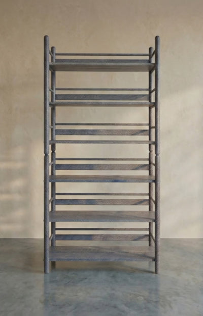 This is a free-standing shelving system made from tubular parts and flat shelves. Two units stacked are 80” high; perfect for a 96” room.